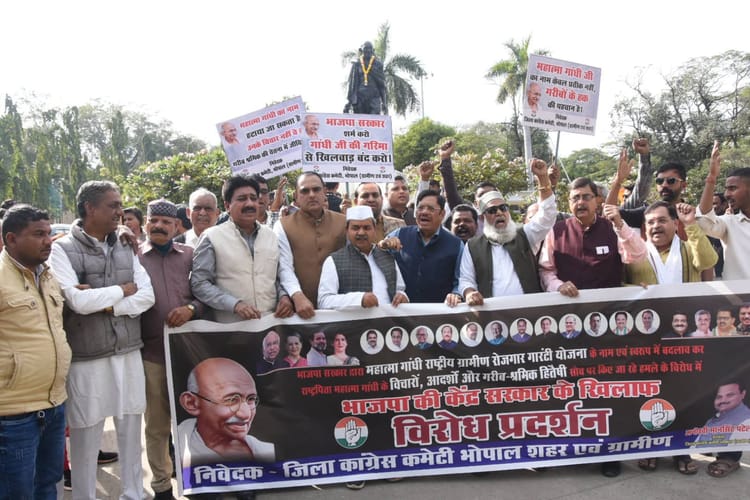 केंद्र सरकार द्वारा मनरेगा योजना के नाम में बदलाव के फैसले को लेकर कांग्रेस ने कड़ा विरोध दर्ज कराया है। रविवार को भोपाल कांग्रेस कमेटी ने मिंटो हॉल में महात्मा गांधी की प्रतिमा के सामने धरना-प्रदर्शन कर इस निर्णय को राष्ट्रपिता के सम्मान पर सीधा हमला बताया। प्रदर्शन के दौरान कांग्रेस नेताओं और कार्यकर्ताओं ने केंद्र सरकार के खिलाफ नारेबाजी की।धरने में भोपाल कांग्रेस जिला अध्यक्ष प्रवीण सक्सेना, कांग्रेस के वरिष्ठ नेता जेपी धनोपिया सहित बड़ी संख्या में पार्टी कार्यकर्ता मौजूद रहे।