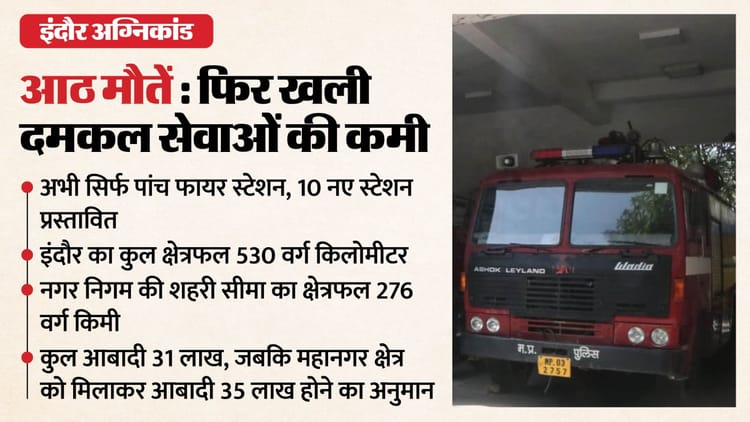 प्रदेश का अग्रणी महानगर बन रहा इंदौर तमाम आवश्यक सुविधाओं के मामले में फिसड्डी साबित हो रहा है। बुधवार को ब्रजेश्वरी कॉलोनी में हुए भीषण अग्निकांड में आठ लोगों की मौत के बाद एक बार फिर अग्नि शमन सुविधाओं की कमी खुलकर सामने आई है। शहर की नगर निगम सीमा के 276 वर्ग किलोमीटर क्षेत्रफल में रहने वाली 31 लाख की आबादी के लिए सिर्फ पांच फायर स्टेशन अभी संचालित हैं, ये बहुत कम हैं। महानगर के लिए आवश्यक संसाधनों की कमी लोगों की जान पर आफत बन रही है। आग लगने के मामलों में अक्सर शिकायत मिलती है कि फायर ब्रिगेड देरी से पहुंची। ताजा हादसे में भी दमकलों के डेढ़ घंटा देरी से पहुंचने का आरोप लगाया है।